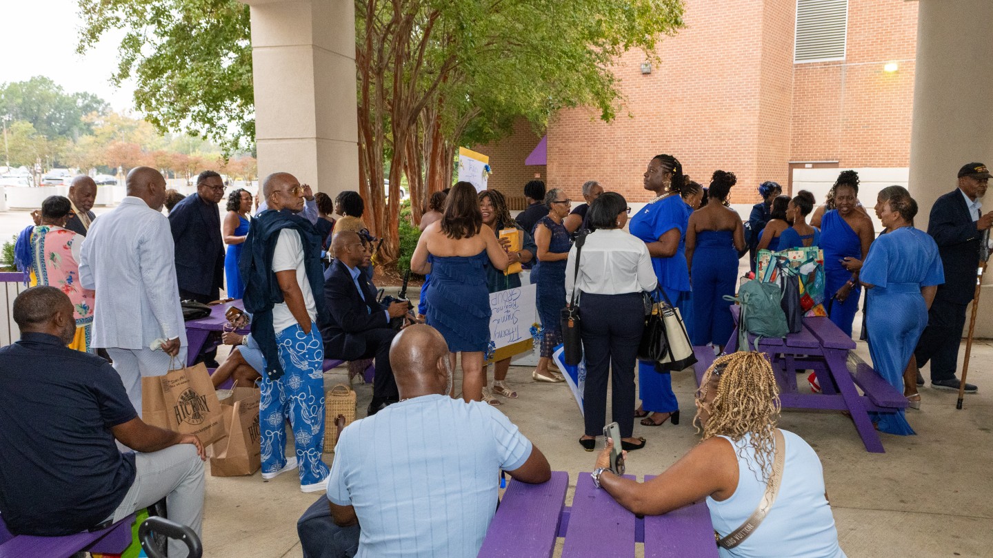 Charlotte, N.C. / September 26, 2025 - Members of the Johnson C. Smith University National Alumni Association painted the Queen City blue in the inaugural Diner en Bleu event during Homecoming 2025. The exclusive event featured African drummers who led the gallant parade of patrons into the sprawling parlor. JCSU alumni from the 1960s to 2020s arrived adorned in a kaleidoscope of blue: sapphire gowns, cobalt ties, royal blue dresses, true-blue suits, and Oxford blue pocket squares. Alumni came ready to party and to give.